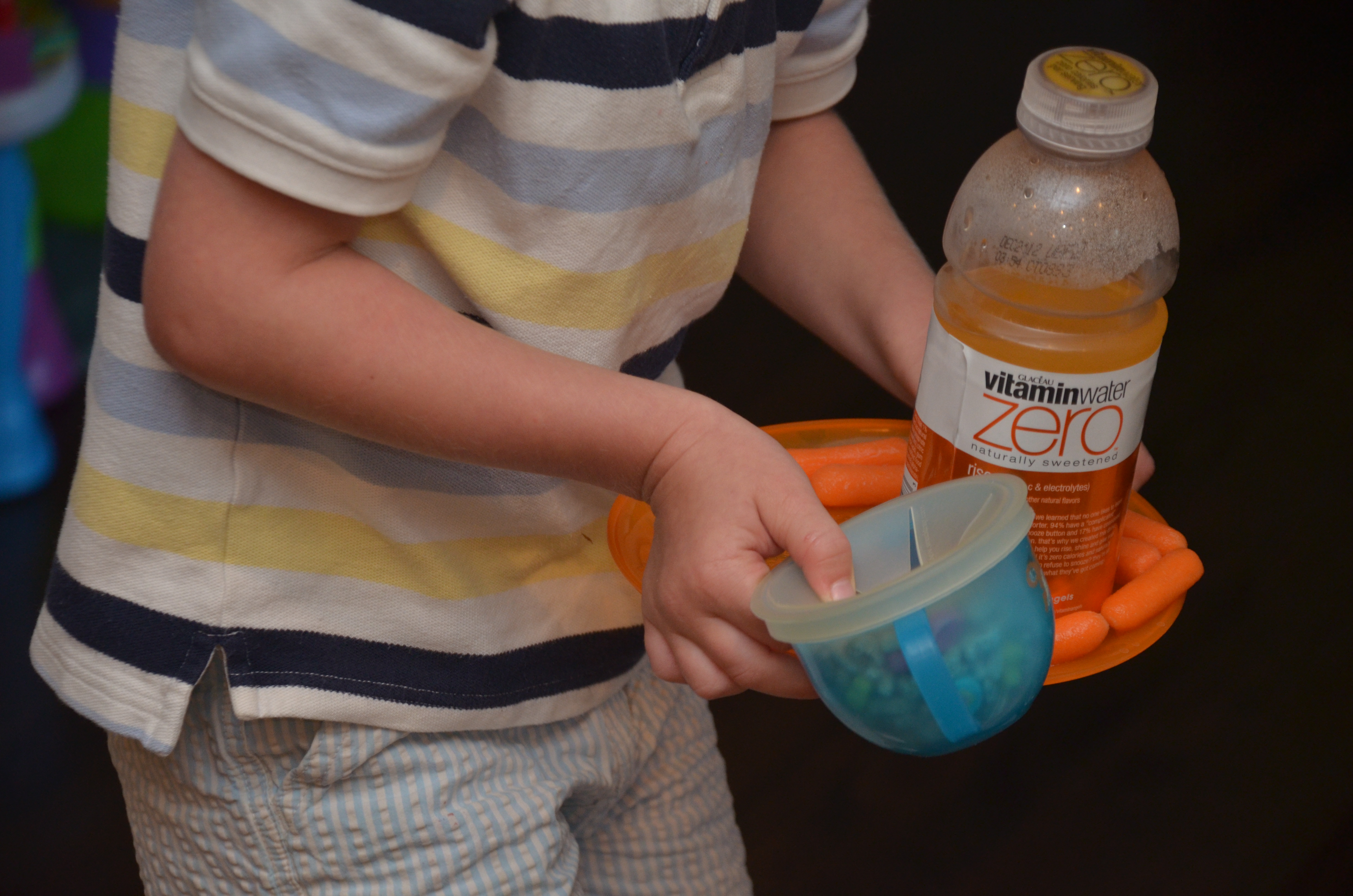 My Orange breakfast to “make you smile mommy.” Carrots, gold fish and Vitamin Water I keep in case I want to yell.
